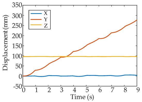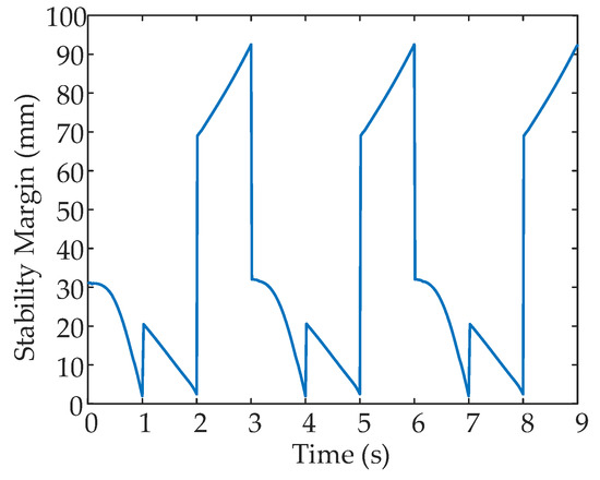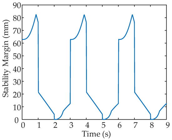 In a period, three processes are executed in sequence. Legs alternately transfer and support. Figure 15 and Figure 16 show some simulation sequences under the leg 1 fault state at different times from the lateral and the vertical view, respectively. The swing sequence of the legs can be observed in Figure 15, and accords with the planned sequence. Figure 16 displays the posture after each process in the F-TT gait; the gesture after coxa initialization angle adjustment has been demonstrated in Figure 16 when . To measure the locomotion of the hexapod robot, the displacement curves of the COG are shown in Figure 17. It can be concluded that the robot has a uniform speed along the Y-axis, and the fluctuation in the X and Z directions is slight. The main reason is that, due to the failure of leg 1, the symmetrical structure of the hexapod is damaged and the left side is only supported by one leg, resulting in about 10 mm displacement in the X-axis direction in three periods. In order to observe the stability margin intuitively, the support position is measured, and the stability margin is calculated using Equation (1). Figure 18 presents the detail at any time the stability margin is nonnegative.