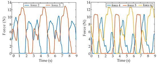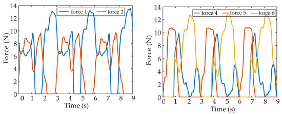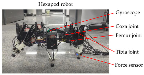 To verify the effectiveness of the proposed fault-tolerant gait in practical robots, the experiments were implemented in an authentic hexapod robot. The experimental platform of the hexapod robot is illustrated in Figure 23. For the experiments, six force sensors were installed at the bottom of the foot end to collect the normal contact force between the foot and the ground, and a gyroscope, mounted on the body center, collected the attitude data of the hexapod body.