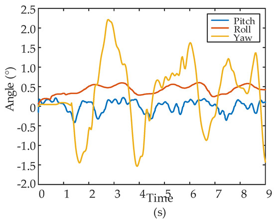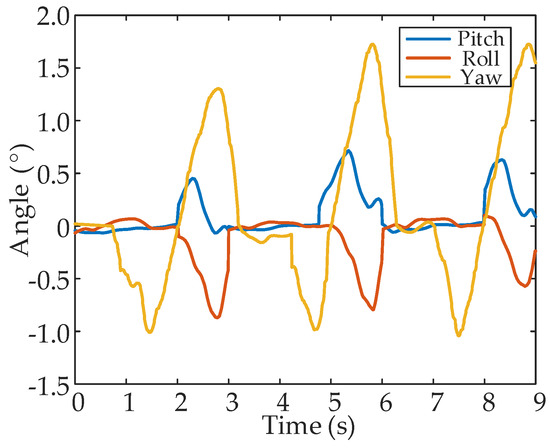 Figure 24 shows a set of snapshots of the walking experiment with leg 1 fault; clearly, the legs lift, transfer and support as planned. Figure 25 shows the curve of the normal contact force data collected at the foot end. The force can reflect the phase of each leg, because it exists only in the support phase. Leg 1 has no contact force with the ground, and the remaining five normal legs alternate to form a support triangle. At least three legs are in the support phase at each time. Figure 26 shows the attitude data of the COG. The pitch and roll angle change slightly, ranging from −1.0° to 1.0°, and the yaw angle ranged from −2.0° to 2.0°.