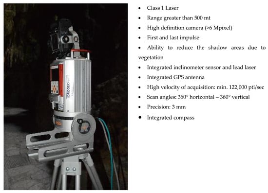 The survey, carried out in the case studies of this work with a Laser Scanner RIEGL VZ400 (Figure 1), allows acquisition of a georeferenced point cloud of millions of points, each one of which is described by the following information: geographical position in space (X, Y, Z), chromatic information (RGB), and reflectance (i).