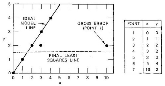 Failure in the reduction to least squares for the estimation of data affected by gross error (after [60]).