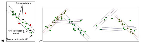 In the case more subsets of coherent data are present, the algorithm eliminates all those points belonging to the line that has the highest consensus (in red) and repeats the procedure of researching of the line which best approximates the remaining points (Figure 4; [62]).