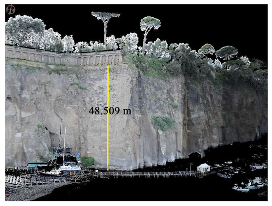 Texturized point cloud at the Santa Caterina cliff. The yellow vertical line provides the height of the cliff.