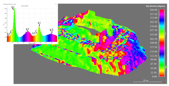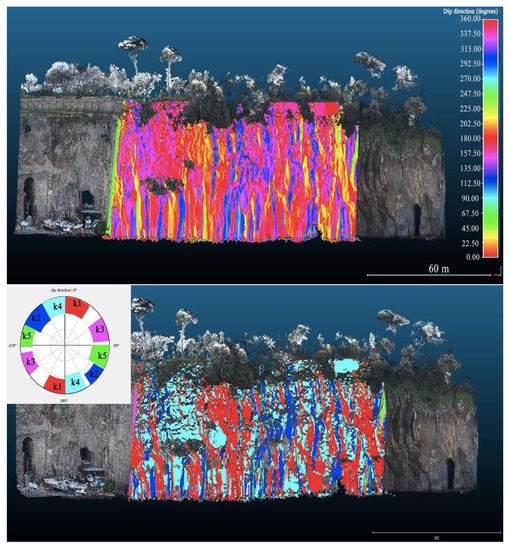 The geo-structural analysis is carried out through innovative methods that allow measurement of the attitude directly on the point clouds. Specific software perform analyses of the point clouds, measuring the values of the normals associated to the identified planes, and how these adapt to aggregates of sets of adjacent points [57,58]. These normals define the orientation of the geometrical bodies to which they belong in space, and are in turn expressed by three spatial coordinates. Thus, starting from the point cloud and its DSM (in the case of rock masses coinciding with the DTM), it is necessary to estimate the analytic equations, in the form AX + BY + CZ + D = 0 (plane equation), determining orientation and position in the space of the planes that better approximate locally the point cloud.