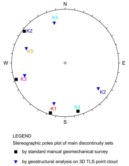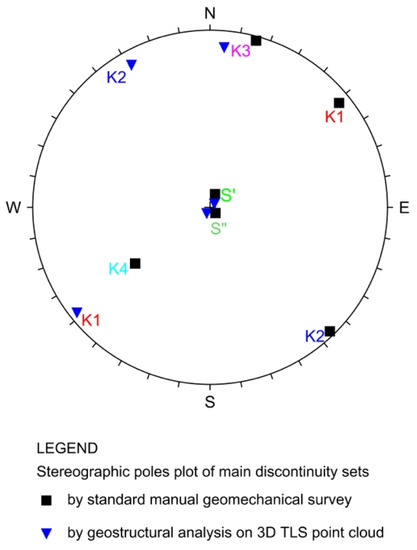 Stereo-photogrammetric techniques are nowadays frequently being used to measure the orientations of discontinuities [28,29,30]. Adoption of the basic principles of photogrammetry can in fact result extremely useful in rock mechanics and in the evaluation of rock stability as well. The first attempts in this direction, however, were quite frustrating due to the long time required to precisely outline the discontinuities, and the slowness in their elaboration [31,32,33,34,35,36]. Only during the recent decades, thanks to availability of powerful computers, and advancement in the technologies, these techniques have become widespread, and several approaches have been proposed to obtain 3D models of rock faces by remote sensing data. Among these, terrestrial laser scanners (TLS) and unmanned aerial vehicles (UAV) have undoubtedly proved to be among the most efficient and reliable tools, and are being today used in many stability analyses worldwide [37,38,39,40,41,42,43,44,45,46,47,48,49,50].