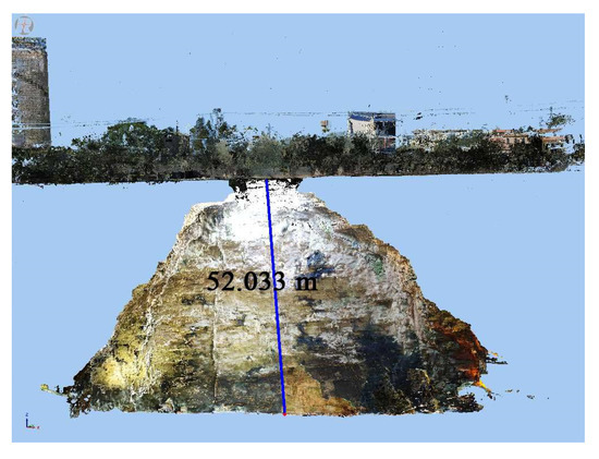 The 3D geometrical model obtained through the combined laser scanner-drone survey produced a high-definition point cloud consisting of 55.6 million points (corresponding to a point density of 6950 pt/m2), 15.5 million (2000 pt/m2) out of which were from the laser scanner, and 40.1 million (3160 pt/m2) from the drone (Figure 6). This cloud, properly georeferenced with GPS and Total Station, allowed to measure the bedding and spacing of any plane in the rock mass, which is a crucial element for the following phase of designing the stabilization works.