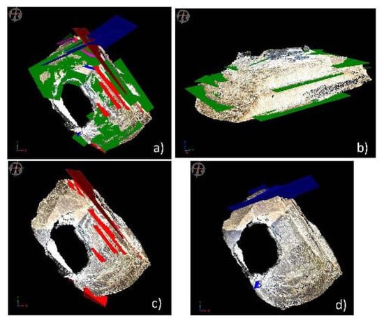 The most used methods to define and measure these planes are the least squares and the geometric segmentation of DSM [59]. The least squares method takes into account the whole set of available data. However, it is possible that some of the identified planes might aggregate points belonging to different planes, so that the results can be conditioned by gross errors, commonly present when dealing with experimental data. This problem might result in invalidating the overall validity of the model; in other words, there is the risk to have, within the set to interpolate, points belonging to another plane (Figure 3).