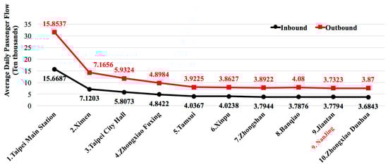 The hourly inbound and outbound flows in the Taipei MRT have been available from the Taipei city government’s open dataset since 1 November 2015 []. Figure 1 shows that Taipei Main Station has the highest average daily passenger flow. Its inbound and outbound flow is twice the second highest total of the top ten stations in Taipei. Therefore, Taipei Main Station was selected as a case study in the experimental section.