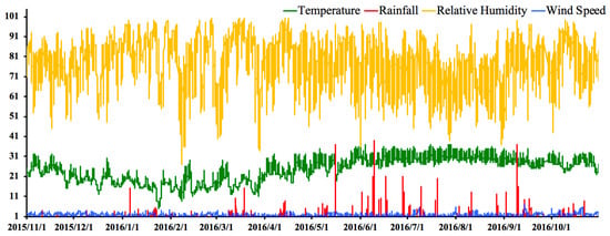 Taipei is a typical city with a subtropical monsoon climate. Figure 2 shows the historical annual weather information from 1 November 2015 to 31 October 2016 around Taipei Main Station. Rainfall was copious throughout the year, especially June through September. However, heavy rainfall was uncommon. The temperatures were usually pleasantly warm with a high relative humidity. The winter months from December to February were colder with a relatively low temperature, less than 20 °C.