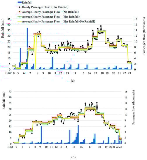 Figure 3b illustrates the impact of rainfall on the hourly outbound passenger flow at different hours on all Saturdays. The most prominent peak hours are 16:00 to 18:00. These single-peak hours are quite different with the double-peak hours on weekdays. Clearly, the hourly passenger flow on the rainy days is less than the passenger flow on days without rain, as during 6:00–13:00 in Figure 3b. However, if the rain is not heavy, people still execute their travel plans, especially 16:00 to 18:00. This period has the largest passenger volume on weekends.