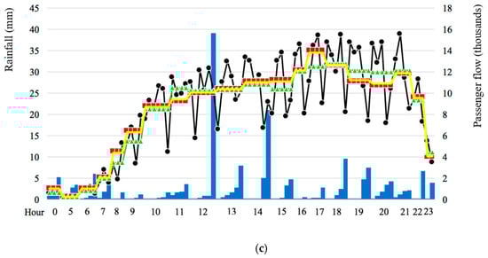 In summary, daily trips on national holidays and weekends are more likely to be affected by rainy weather than trips on weekdays, especially on national holidays, findings that are similar to []. It is verified that the fluctuation of the black line in Figure 3c is more serious compared to the other two. The possible reason is that travel plans on national holidays and weekends are not necessary, and people are more likely to change or cancel their travel plans due to the rainy days. Although the weather conditions are extremely complex, understanding them is important to improve the hourly passenger flow forecasting results for Taipei Main Station.