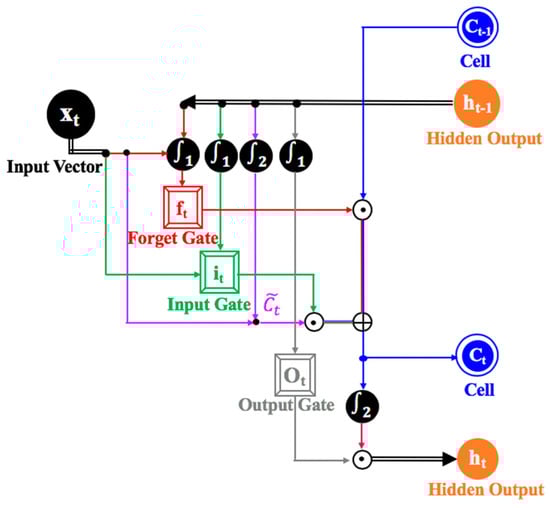 The architecture of a cell in LSTM is illustrated in Figure 4. Its current input data are typically composed of the input vector Xt at time step t, and the hidden output ht-1 at time step t-1. The complete work cycle of a cell in LSTM is as follows. First, the three coupled parameters, namely weights and biases (wi, bi), (wf, bf), and (wo, bo), are trained to formulate the nonlinear relationships between the input gate (it) and [xt, ht-1], the forget gate (ft) and [xt, ht-1], and the output gate (ot) and [xt, ht-1] at time step t, respectively. xt refers to input data at time step t, and ht-1 refers to output data in the hidden layer at time step t-1. The formulations of the three gates are defined in Equations (1)–(3). Second, an input squashing vector () is obtained directly based on Equation (4) without any gate effect at time step t. The new state will then be generated and stored in at time step t under the control of , ,, and , which is shown in Equation (5). This special architecture shows that a cell can add or remove the previous memories stored in with the control of the forget gate. Finally, the hidden output is obtained based on Equation (6) [].