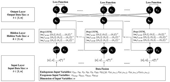 The dataflow in a deep LSTM_NN is shown in Figure 5. There is a total of n training examples in the input data. Each set of input data at time step t is defined as an input vector , where m is the number of input variables and s refers to the number of time steps. When modeling, the input variables are assembled as an input vector, namely [, , , , , , , , , , , , , , ], which is the combination of endogenous input variables and exogenous input variables introduced in Section 2.2 and Section 2.3. Since each set of input data contains the variables of the previous 1-hour, 2-hour, and 3-hour passenger flows, we set s=1 as the parameter of time step. This shows that the previous passenger flows at time step (t-1), (t-2), and (t-3) are used as the input variables to forecast the passenger flow at time step t. It is worth noting that the dimension of the input vector [Xt] is changed by multiplying the weight matrixes based on Equations (1)–(4). As a result, the vectors of , and have the same dimensions of a as the size of the hidden nodes and are not equal to the dimension of n in input vector [Xt]. At the output layer, all the hidden outputs are fully connected to obtain , whose dimension is returned to n. is the forecasting result for the passenger flow and is the actual value of the passenger flow given in the training dataset. This dataflow structure shows that the hourly passenger flow forecasting model can be transformed into a supervised learning problem using a deep LSTM_NN. In other forecast models, was defined as one of the input variables contained in input vector [Xt] [] to fit the model, or as [, which were a series of previous k-hour passenger flows, to be used as the only input variables to fit the model []. In summary, different forecasting tasks should be constructed with the most suitable input variables to obtain the optimized results.
