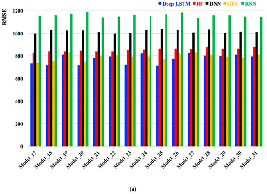 To better analyze the forecasting performance of the deep LSTM_NN, four methods were selected for comparisons, namely RF [], deep neural network (DNN) [], RNN [], and GRU []. We have discussed the optimized combination of the endogenous input variables using RF in our previous study [], and the impacts of added weather variables on passenger flow forecasting have been further studied. Therefore, RF was further selected as one of the important comparative methods. Furthermore, the other three neural networks (DNN, RNN, and GRU) are the typical artificial intelligence algorithms that are successfully applied to many different forecasting tasks. The parameters of n_estimators and max_features in RF were chosen with the same values as in Section 4.2. To make an equal comparison among different neural network models, the parameters used in DNN, RNN, and GRU were the same as in the deep LSTM_NN, described in Section 4.3. The training samples and input variables used in the above four methods were identical to those used in Models 17–31. Figure 6 shows the RMSE and MAPE of the forecasting results in the five methods. The deep LSTM_NN is better than the other four methods when incorporating previous one-hour weather variables as the inputs in most scenarios. These results verify that the deep LSTM_NN can better extract and represent the deep variables of passenger flow embedded in the training dataset. It is a more powerful method for time series forecasting problems.