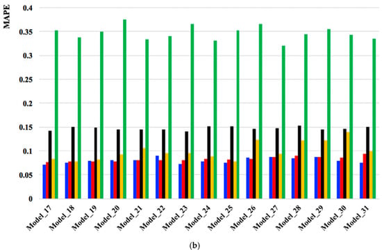 Table 7 shows the experimental results of Models 1–16. Unfortunately, both RMSE and MAPE of the forecast performance in Models 6, 7, and 9–16 was not improved by adding the current hourly weather variables, especially for the combined weather variables as the inputs in comparison with RMSE and MAPE in Model_1. However, adding a single weather variable, such as (MAPE in Model_2), (RMSE in Model_3),(MAPE in Model_4), or (RMSE in Model_5), and the combined weather variable of and (RMSE in Model_8), can improve the forecasting results slightly.