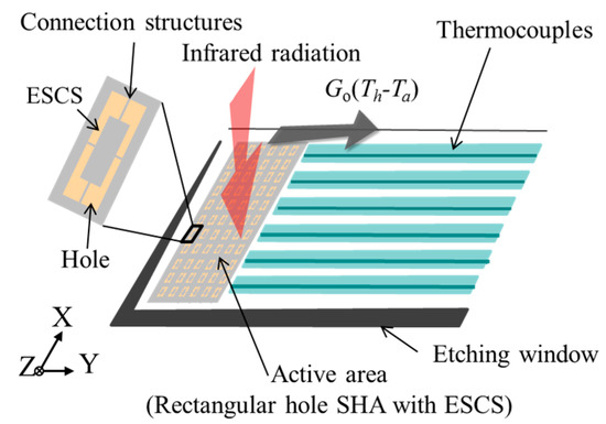 The sketch of the proposed CMOS compatible thermopile is shown in Figure 1. Here is the total thermal conductance, is the hot junction temperature, and is the ambient temperature. The infrared radiation is absorbed in the active area on the front-side of a thermopile. The fabrication of the CMOS compatible thermopiles with SHA was considered as it uses the 0.35 μm 2P4M CMOS- micro-electro-mechanical systems (MEMS) process in the Taiwan Semiconductor Manufacturing Company (TSMC) [16].
