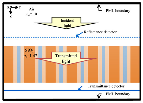 In the above premise, we designed a thermopile with various SHAs by using the FDTD method. The FDTD method is an accurate and available technique to study thermopiles with SHA [13]. The sketch of the simulation model is shown in Figure 2, where is the air refractive index and is the SiO2 refractive index. Here we considered = 1 and = 1.42. For the FDTD method, an artificial boundary condition was required to suppress reflections at the analysis windows. The perfectly matched layer (PML) (ABC) is an absorbing boundary condition and is used to truncate the computational domain without reflection [17,18]. A perfect matched layer (PML) was applied to decrease the error caused by simulated region boundaries.