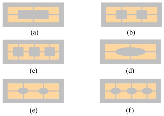Top-view sketch of the six ESCSs, (a) one rectangular column (RC), (b) two RCs, (c) three RCs, (d) one ellipse column (EC), (e) two ECs, and (f) three ECs.