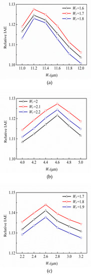 Variances of the relative infrared absorption efficiencies (IAEs) with different and for the thermopiles with RC-type ESCSs at the target temperature 75°, (a) one RC, (b) two RCs, and (c) three RCs.