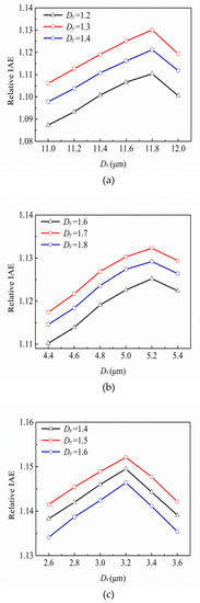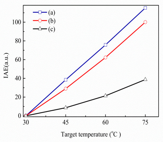 For the types of rectangular column, the variances of the relative IAEs with different and for the thermopiles with RC-type ESCSs at the target temperature of 75 °C are shown in Figure 4. It was seen that for the types of one RC, two RCs, and three RCs, the better relative IAEs were 1.128, 1.127, and 1.144 times, respectively. It was obtained that the and of the better case are 2.6 μm and 1.8 μm, respectively. For the types of ellipse column, the variances of the relative IAEs with different and for the thermopiles with EC-type ESCSs at the target temperature 75 °C are shown in Figure 5. One can see that for the types of one EC, two ECs, and three ECs, the better relative IAEs are 1.130, 1.132, and 1.152 times, respectively. It was obtained that the and of the better case were 3.2 μm and 1.5 μm, respectively. Those results of the better relative IAEs and the geometric parameters for the six ESCSs are listed in Table 1. Finally, the variances of the IAEs with the target temperature for the SHA thermopiles of (a) the best case in this study and (b) the best case in [16], and (c) the thermopile without SHA, are shown in Figure 6. One can see that the IAE of the CMOS compatible thermopiles was significantly enhanced when the subwavelength hole structure existed in the active area of the thermopiles, especially when the special structure in the rectangular hole array was added.