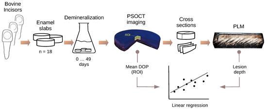 Workflow of the preparation and artificial demineralization of bovine enamel slabs, polarization-sensitive optical coherence tomography (PSOCT) imaging, cross-sectioning and polarized light microscopy (PLM) measurements, and data analysis.