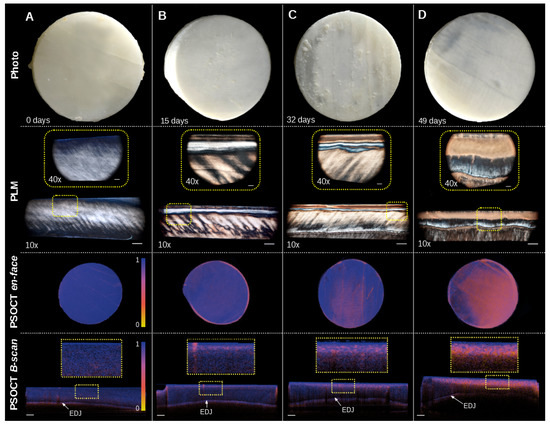 Overview of the results: Photographs of the demineralized enamel slabs, PLM images of the thin cross sections with two different magnifications, degree of polarization (DOP) representations of the PSOCT measurements as en-face projections and B-scans, including samples with a demineralization time of 0 (A), 15 (B), 32 (C), and 49 (D) days. EDJ: Enamel dentin junction. Scale bars PLM: 400 µm (10×), 80 µm (40×); Scale bar PSOCT: 400 µm.