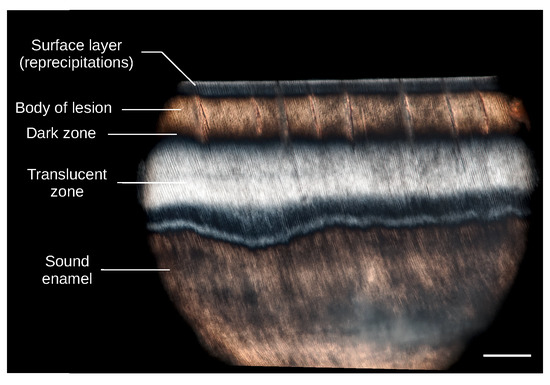 PLM image (40× magnification) of an enamel slab at 25 days of demineralization with characteristic zones of lesion formation. Scale bar: 80 µm.
