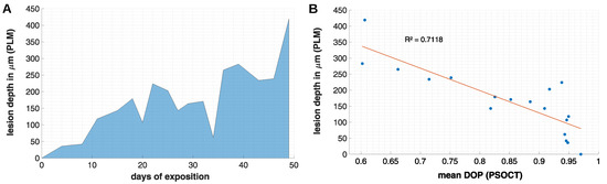 In the further course, the demineralization layer was predominantly defined by the body of the lesion (Figure 2C,D; PLM). The measured thickness of the demineralization layer increased over time (Figure 4A) whereas the maximum lesion depth was 419 µm at day 49. The general increase of lesion depth over time also showed a high variability with an outlier at day 34 (Figure 4A; lesion depth: 62 µm). PSOCT en-face representations of DOP values showed no depolarizing effect at the sound enamel layer at day 0, which can be confirmed by the cross-sectional B-scan (Figure 2A; PSOCT). A slightly higher depolarization was observed at day 15 (Figure 2B; PSOCT en-face), which became more pronounced in the corresponding B-scan where a subsurface layer with decreased DOP is present (zoom view of PSOCT B-scan at Figure 2B). With further demineralization, an increased depolarization is visible, indicated by decreasing DOP values in the en-face projections at Figure 2C,D. The corresponding B-scans show a strong depolarization (low DOP values). The linear regression between lesion depth measured with PLM and the mean DOP values at the central region of interest showed a substantial linear correlation (Figure 4B; ).