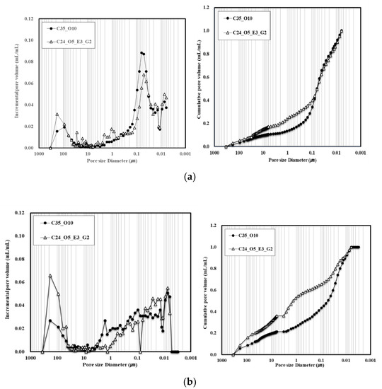 Figure 11b shows the relation between porosity and chloride ion diffusion coefficient. For C24_O3_E5_O2, the increase in watertightness due to the reduced porosity significantly reduced the chloride ion diffusion coefficient. Figure 12 shows the pore structure with age. Evidently, C35_O10 had more micropores smaller than 1 µm than C24_O3_E5_O2, indicating that the substitution with EPC and GGBS could not reduce micropores, even though it affected the reduction in overall porosity.