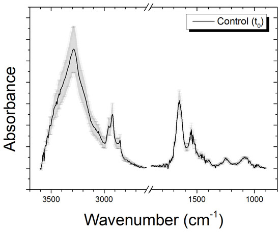 Average spectrum of an unexposed sample in the range 3600–900 cm−1; the break at 2600–1900 cm−1 hides a region without interesting signals from biological molecules; data are presented as MEAN ± SD.