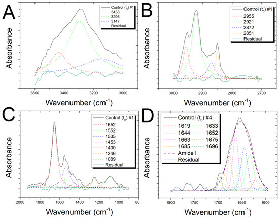 In Figure 2A–D, the deconvolution for the spectra in the regions 3600–3000 cm−1, 3000–2700 cm−1, 2000–600 cm−1, and 1800–1600 cm−1 are, respectively, shown. In Table S1 (Supplementary Material), the assignments for all the resolved peaks are shown [10,12,13,39,47]. In Tables S2 and S3 (Supplementary Material), the assignments for the subcomponents of the Amide I region are shown [37,38,39].