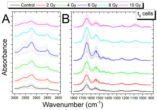 Comparison of average Fourier transform infrared (FTIR) spectra in the region 3000–2700 cm−1 (A) and in the region 1800–900 cm−1 (B) between the control cells (0 Gy) and irradiated cells (2, 4, 6, 8, 10 Gy) fixed immediately after irradiation; the spectra are shifted in absorbance to allow the comparison, data are presented as MEAN ± SD.