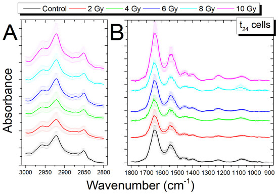 Comparison of average FTIR spectra in the region 3000–2700 cm−1 (A) and in the region 1800–900 cm−1 (B) between the control cells (0 Gy) and irradiated cells (2; 4; 6; 8; 10 Gy) fixed 24 h after irradiation; the spectra are shifted in absorbance to allow the comparison, data are presented as MEAN ± SD.