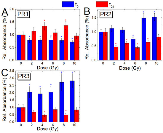 Comparison of the absorbance ratios PR1 (A), PR2 (B), and PR3 (C) with dose, for cells fixed immediately (blue) and 24 h after irradiation (red); the ratio variations (Mean ± SD) are reported, as a value normalized with respect to the corresponding ratio value of the non-irradiated samples (0 Gy, t0; 0 Gy, t24); blue and red asterisks indicate when a significant difference in respect to the control value for the t0 and t24 samples, respectively, occurred at .