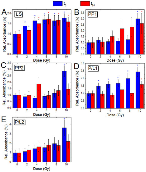 The ratios P/L1 (Figure 6D) and P/L2 (Figure 6E), both linked to cell protein/lipid content, show an increasing trend with the dose for t0 cells, which is significant (p < 0.05) at all doses and at 10 Gy dose, respectively; on the contrary, t24 samples show a significant shift to a higher value (p ≤ 0.05) only for the P/L2 ratio at 10 Gy. The analysis of the P/L1 and P/L2 changes indicates modifications in membrane fluidity and their protein content [43].