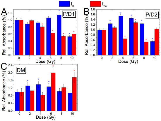 Comparison of the absorbance ratios P/D1 (A), P/D2 (B), and DM (C) with dose, for cells fixed immediately after (blue) and 24 h after irradiation (red); the ratio variations (Mean ± SD) are reported as a value normalized with respect to the corresponding ratio value of the non-irradiated samples (0 Gy, t0; 0 Gy, t24); blue and red asterisks indicate when a significant difference in respect to the control value for the t0 and t24 samples, respectively, occurred at .