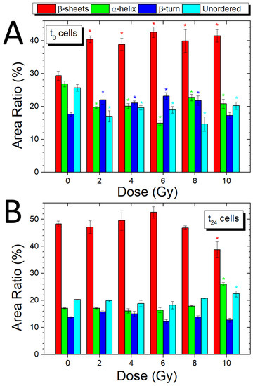 The ratio between the absorbance of Amide I and Amide II bands (PR1) shows a significant decrease (p ≤ 0.05) at all doses for t0 cells, while for the t24 cells, values higher than for the 0 Gy sample are shown for all doses, except the 10 Gy one. PR2 shows a decrease for the t0 cells, compared to the control, at 6 Gy (p ≤ 0.05) and a significant increase at 8 and 10 Gy (p ≤ 0.05), while the PR3 ratio shows increasing values for all doses (p ≤ 0.05). Conversely, for t24 cells, values lower than those of the unirradiated sample are visible for all doses for both ratios. The changes occurring in PR1, PR2, and PR3 values are due to changes in the secondary structure of proteins and can be also correlated with the above-mentioned changes in the contribution of enzymes (that are mainly proteins) involved in DNA repair processes. Further information about the changes in the secondary structure of the protein component of cells will be reported in the following Section 3.5.
