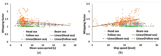 - We studied the correlation between the whipping factors of the vertical bending component and the corresponding sea state and ship operational conditions. As a result, it was found that the whipping factor slightly decreased as the wave period increased. In addition, the whipping factor tends to be larger in head seas, and larger ship speeds result in greater whipping factors in head seas. In contrast, a larger ship speed does not affect or even slightly reduces the whipping factor in following seas.