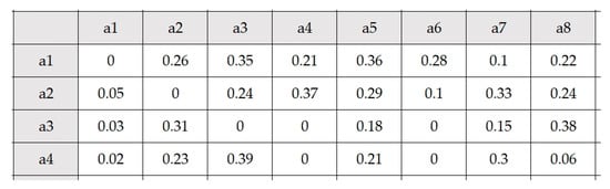 The influence matrix. a1–a8 indicates intrusion actions. The IF value of a1 on a2 is 0.26.