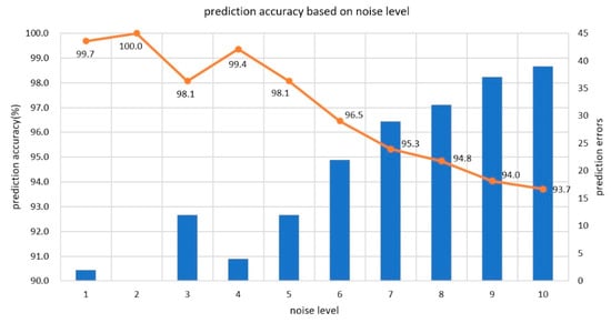 There are more prediction errors than the result of the noisy data evaluation. The average accuracy of prediction for each pattern session is 89.7%. The relation between prediction accuracy and the disorder level is illustrated in Figure 6.