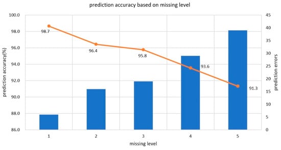 The average accuracy of the predictions made for particular input is 96%, which means the algorithm has a strong resistance to the incomplete data. The relation between the missing level and the prediction accuracy is shown in Figure 7.