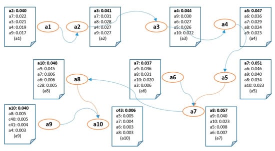 As shown in Figure 12, the orange circle denotes the action, and the attraction list lists the top five actions that are heavily influenced by the specified action. The first bold action in the list is the next action that the particular action will point to and the float numbers in the list are the comprehensive influence factors. There are two orange arrows in Figure 12 pointing at the wrong actions comparing with the initial pattern which means the proposed method needs more adjustment and optimization. The influence threshold can be used to filter out the actions with influences below , thus, there are no subsequent actions after a10. The correlation graph can be updated over time and the links between actions will be altered too.
