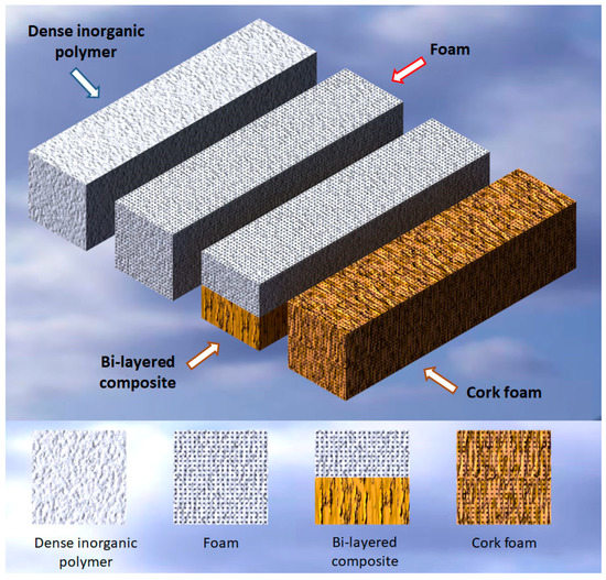 Schematic drawing of the distinct set of samples produced in this study: dense inorganic polymer, foams, bi-layered composites, and cork foams.