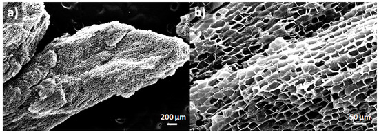 Scanning electron microscope (SEM) micrographs at two different magnifications (a,b) showing the microstructure of the cork granules.