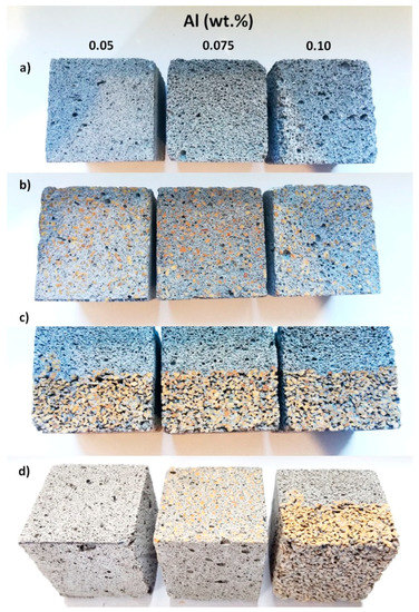 In this study three different sets of samples were produced: (i) foams: by adding varying amounts of Al powder to the inorganic polymer slurries; (ii) cork foams: adding 75 vol.% of cork and variable amounts of Al powder; and (iii) bi-layered composites formed by a porous upper layer with variable porosity, and a bottom layer containing cork (75 vol.%). Additionally, a dense composition (prepared without using Al or cork) was prepared and used as reference. This is further described in the schematic drawing shown in Figure 1.