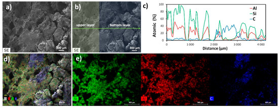 SEM micrographs (a,b), energy-dispersion spectroscopy (EDS) line profile (c) and elemental mapping (d,e) of the bi-layered composite prepared with 0.1 wt.% Al. In Figure 4b the two layers are identified using colors (porous upper layer—highlighted in light green; cork-containing (bottom) layer—highlighted in light blue) and the location and direction of EDS line profile identified by an arrow.