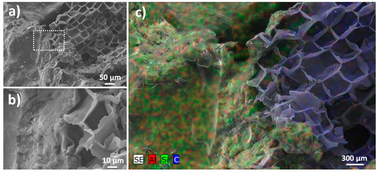 SEM micrograph at two magnifications (a,b) and corresponding EDS elemental mapping (c) for the cork-foam prepared with 0.10 wt.% Al.