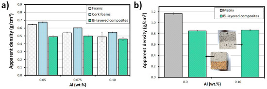 (a) Influence of the Al powder amount on the apparent density of the various compositions. (b) presents the apparent density of the matrix and of the bi-layered composites prepared without foaming agent and without cork. The microstructure of these bi-layered specimens is lustrated by the inset digital photographs.