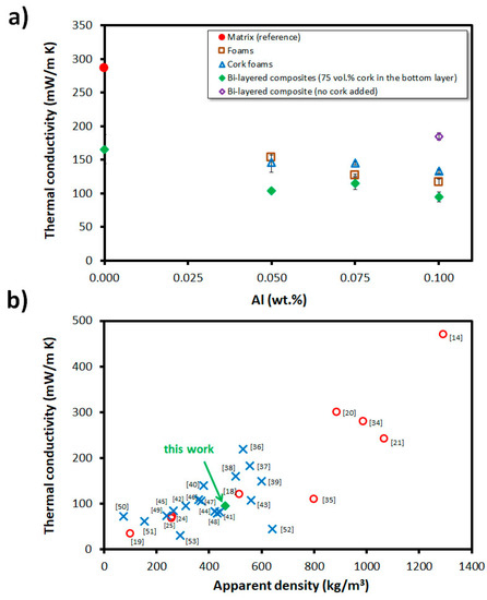 The thermal conductivity of the inorganic polymer specimens developed in this study is presented in Figure 7a. The matrix presents a fairly low thermal conductivity, and this is explained by the mixture composition which has been intentionally designed to produce low thermal conductivity materials. As expected, the addition of the foaming agent reduced the thermal conductivity of the foams, higher Al amounts inducing a stronger reduction. The cork foams show similar thermal conductivity in comparison with the foams, in line with their comparable apparent densities. The bi-layered composites showed the lowest thermal conductivity values demonstrating the interesting potential of this innovative material. The lowest thermal conductivity (94.9 mW/m K) was observed in the specimen containing the highest amount of foaming agent (0.1 wt.% Al) in its upper layer.