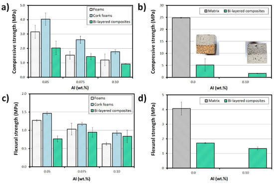 The mechanical performance of the various inorganic polymers is shown in Figure 8. For comparison, the values observed for the bi-layered bodies prepared without adding foaming agent to the upper layer (left-side inset in Figure 8b) and for that prepared without adding cork to the bottom layer (right-side inset in Figure 8b) were included in Figure 8b,d. The reference composition (prepared without cork or foaming agent) reached a compressive strength of 24.8 MPa and a flexural strength of 4.1 MPa. All the lightweight specimens showed much lower strength. A strong decline (~eightfold reduction) in the samples’ compressive strength was observed when adding 0.05 wt.% Al, and the strength further decreased when a higher level of foaming agent was added. Nevertheless, the higher porosity foam (produced with 0.10 wt.% Al) has a compressive strength of 1.2 MPa. Interestingly, the cork foams show higher strength (compressive and flexural) than the foams regardless of the Al content. The cork foams prepared with 0.05 and 0.10 wt.% have a compressive strength of 4.0 and 1.8 MPa, respectively, this being roughly 22% and 32% higher than their counterparts not containing cork. On the other hand, the bi-layered composites showed the lowest strength values. Nevertheless, the sample produced with 0.10 wt.% Al in the upper layer and 75 vol.% of cork in the bottom layer has a compressive strength of 0.93 MPa and a flexural strength of 0.84 MPa.